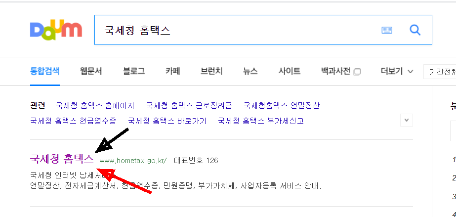 우선 인터넷 검색창에 국세청 홈텍스를 입력합니다. 그리고 화면에 보이는 국세청 홈택스를 클릭합니다.